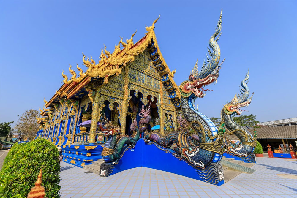 - Chùa Wat Rong Suer Tean (chùa Xanh) – một trong những ngôi chùa đẹp nhất vùng Đông Bắc Thái Lan. Ngay từ khu vực ra vào, ngôi chùa đã gây ấn tượng mạnh mẽ với du khách bằng những hình thù điêu khắc tinh xảo trên những hàng cột của cổng chào. Bước thêm vài bước, bạn sẽ không khỏi choáng ngợp bởi vẻ lộng lẫy của chánh điện. Không chỉ dừng lại ở sắc xanh ma mị, hiếm thấy, toàn bộ ngôi chùa đều được bao phủ bởi những chi tiết trang trí mạ vàng tỉ mỉ, cầu kỳ đến khó tin.