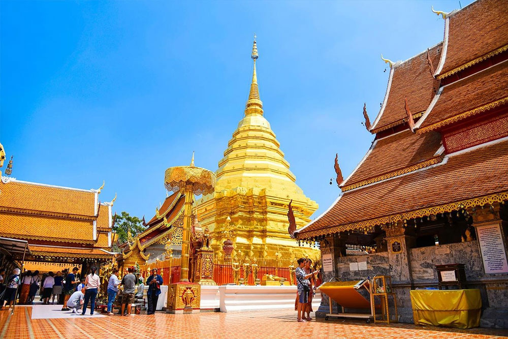 Sau bữa sáng, đoàn làm thủ tục trả phòng. Quý khách tham quan Chùa Doi Suthep. Đây là ngôi chùa nổi tiếng và thiêng liêng nhất tại Chiang Mai, được người Thái Lan tin sùng và là nơi rất nhiều tín đồ Phật giáo đến hành hương trong các ngày lễ lớn, du khách thường ví von rằng nếu đến Chiang Mai mà chưa Viếng chùa PhraThat thì coi như chưa đến thành phố này. Theo truyền thuyết, xá-lợi của Đức Phật được thờ tại ngôi chùa này, do một Tăng sĩ tên là Sumanathera mang từ Sukhothai đến Lanna vào năm 1371. Khi xá-lợi được mang đến Lanna, vua Kuena đã cho xây một chedi (tương tự như một ngôi tháp) tại chùa SuanDak để thờ một phần, và phần còn lại được thờ tại Phra that Doi Suthep